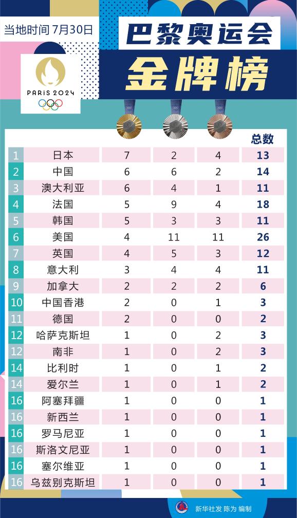 巴黎奥运会|7月30日巴黎奥运会金牌榜