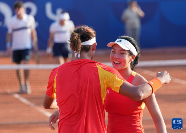 7月30日,中国组合王欣瑜(左)/张之臻在比赛中庆祝。新华社记者 万象 摄