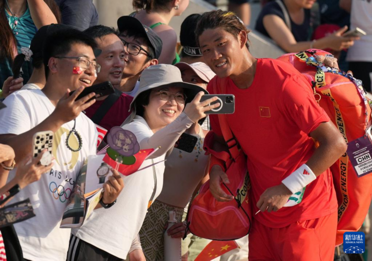 7月30日,中国队选手张之臻(右一)与球迷在赛后合影。新华社记者 万象 摄