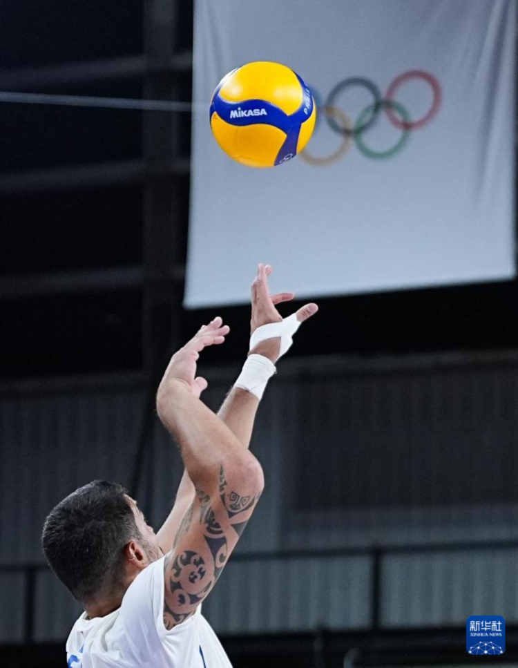 7月30日,法国队球员勒戈夫在比赛中发球。