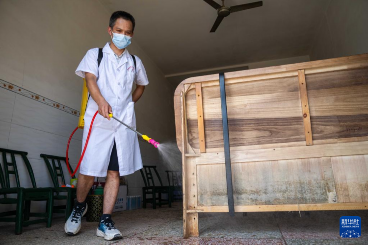 7月31日,在湖南省湘潭县易俗河镇新塘村,医务人员入户给村民家消毒。