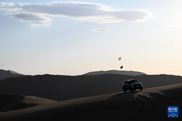 一辆越野车在巴丹吉林沙漠中穿行(7月30日摄)。