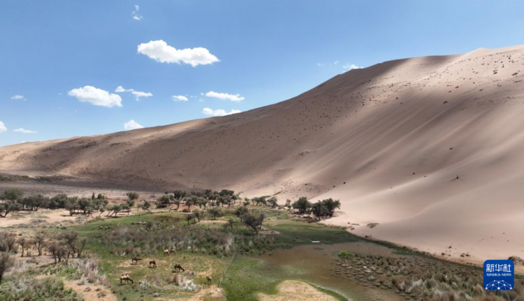 7月30日拍摄的巴丹吉林沙漠中的骆驼(无人机照片)。
