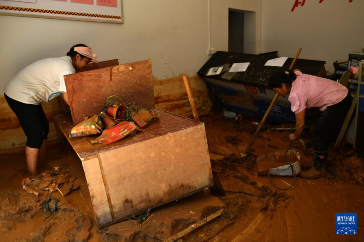 7月30日,在资兴市八面山瑶族乡青腰村,村民在清理淤泥和垃圾。