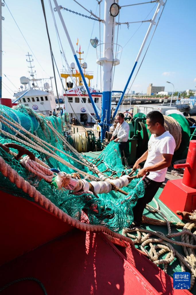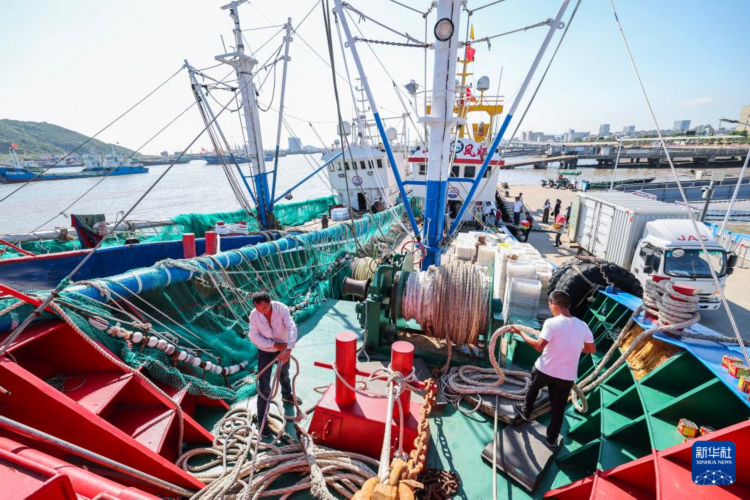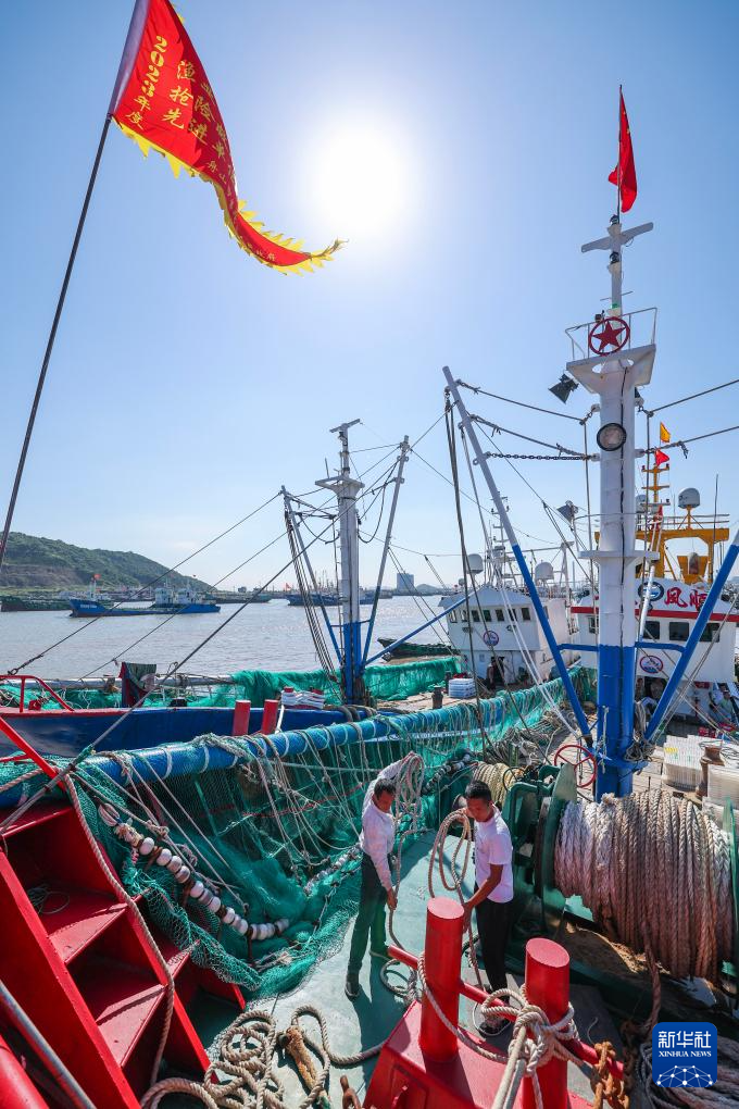 7月31日,在舟山市普陀区沈家门渔港内,渔船上的渔民在整理渔网、绳索,准备开渔。