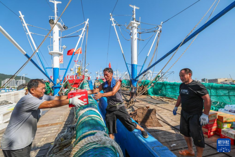 7月31日,在舟山市普陀区沈家门渔港内,渔船上的渔民在搬运物资,准备开渔。