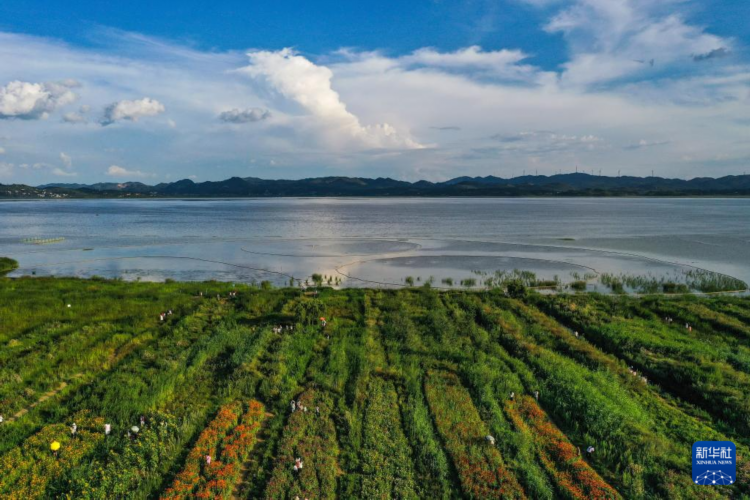8月1日,游客在贵州省威宁县草海景区的花海中游玩(无人机照片)。