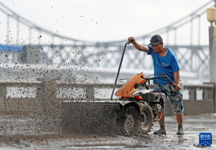8月1日,工作人员在丹东市鸭绿江公园清理淤泥。