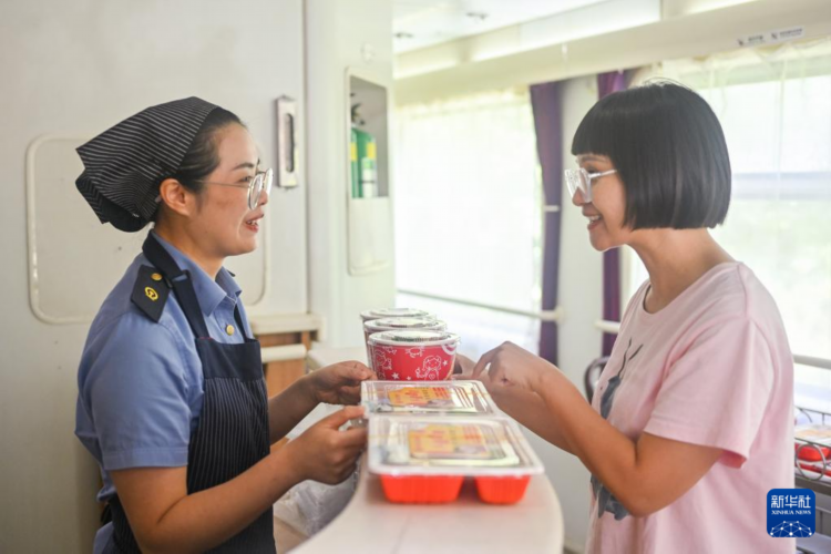 8月1日,在K210次列车上,杭州客运段工作人员将制作完成的儿童套餐放入小推车,准备前往车厢销售。