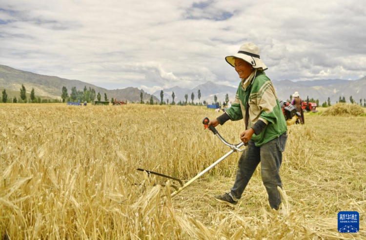 近日,西藏山南市扎囊县迎来青稞丰收季,人们忙着收割青稞,感受丰收的喜悦。