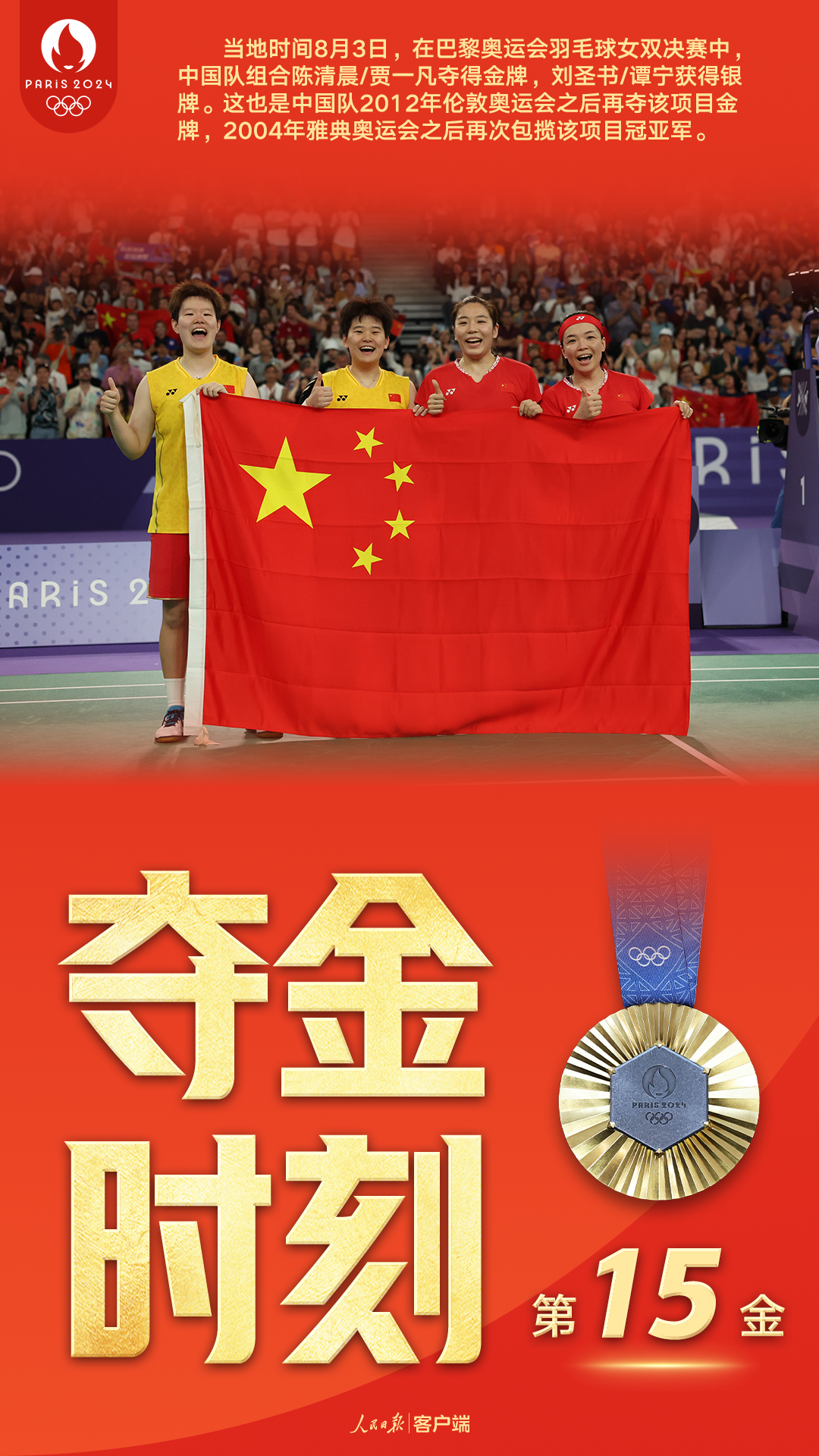第15金!陈清晨/贾一凡夺金,国羽包揽女双冠亚军