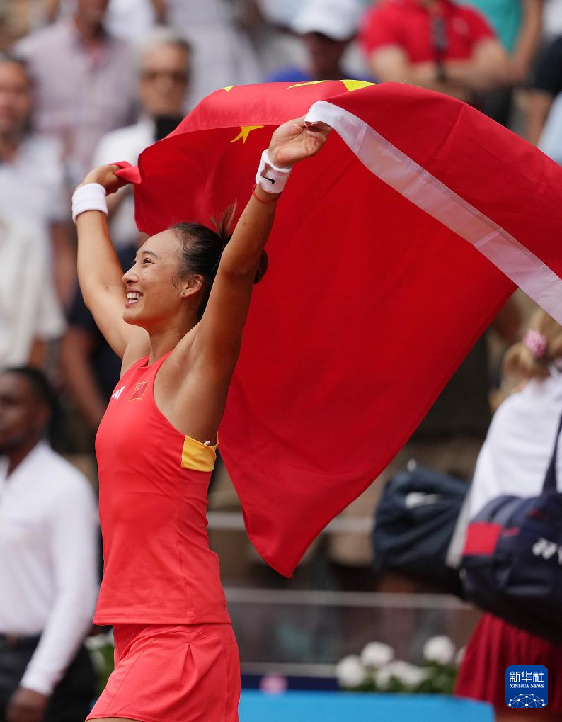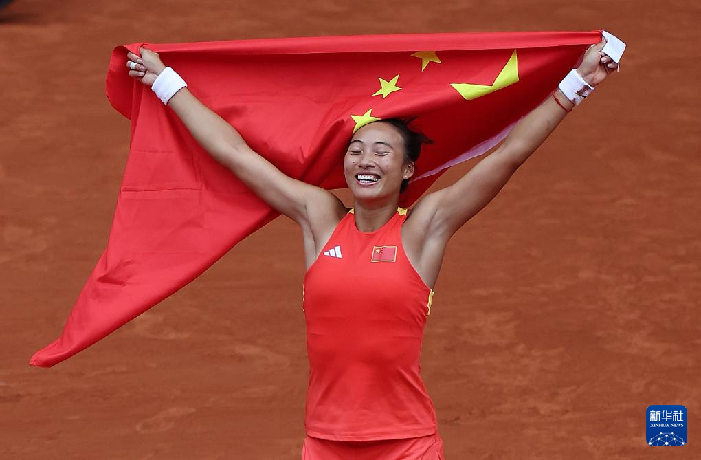 8月3日,郑钦文在比赛后身披国旗庆祝夺冠。