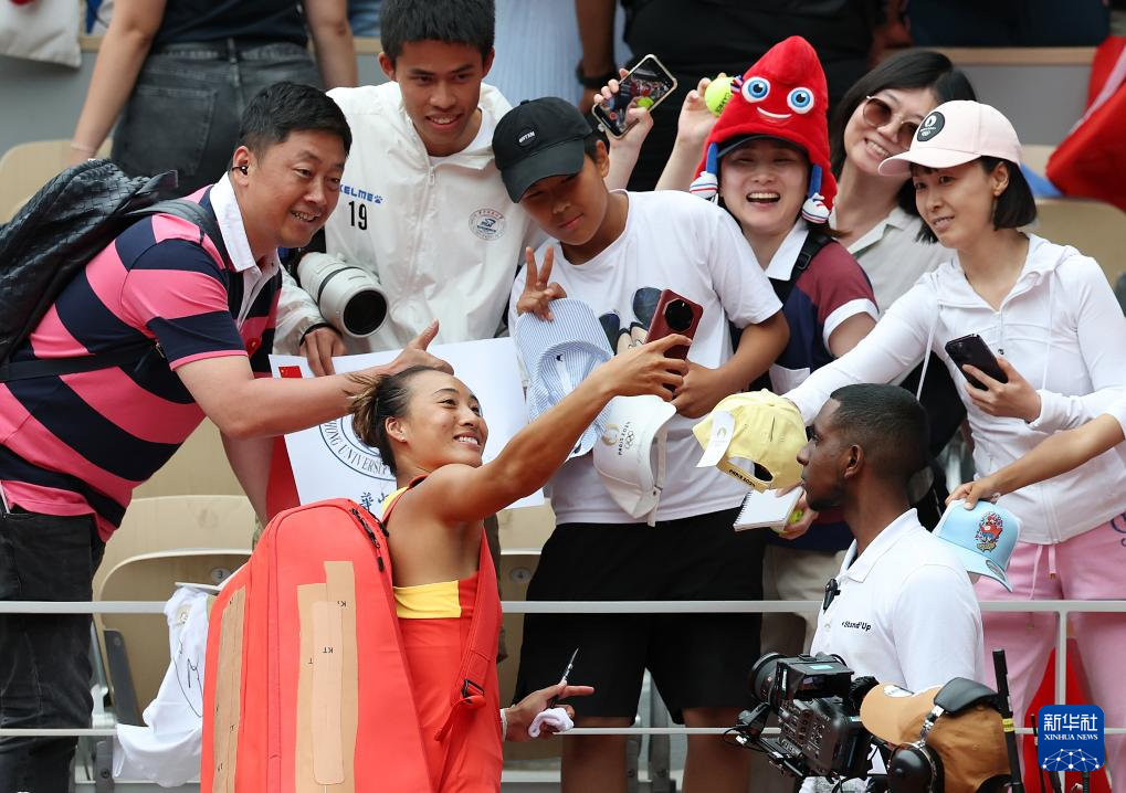 8月3日,郑钦文(左下)在夺冠后与观众合影。