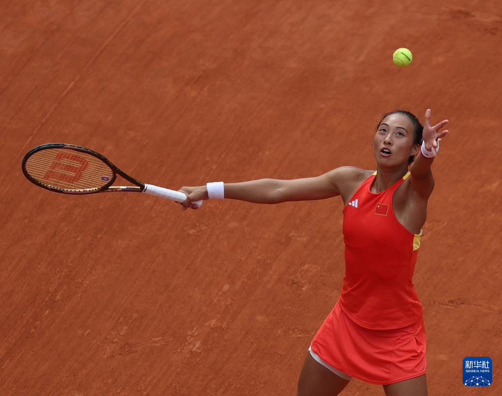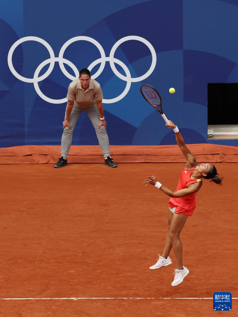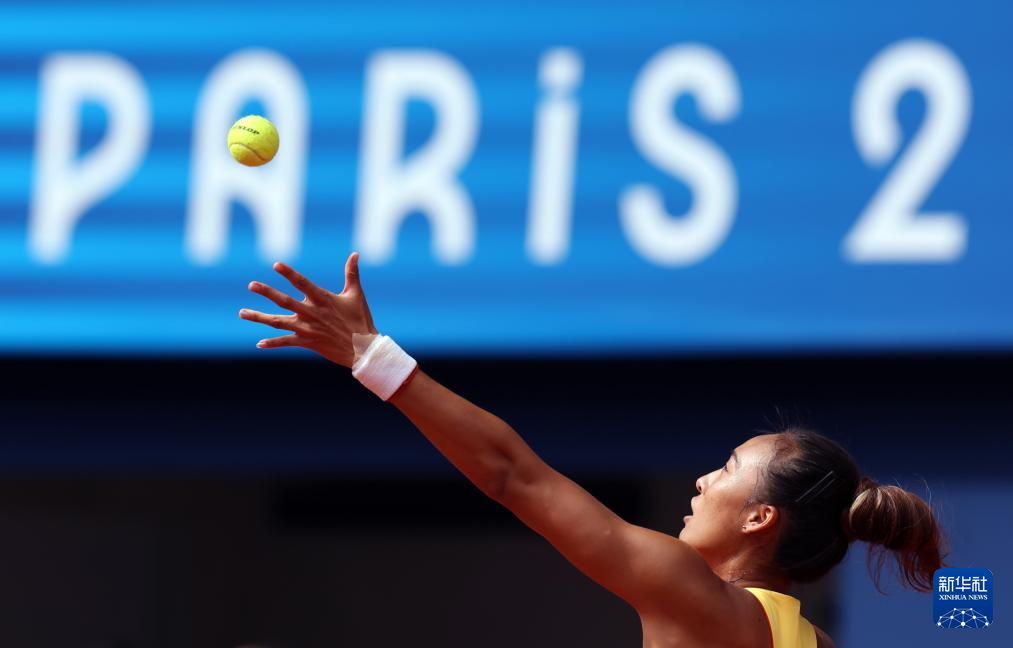 8月3日,郑钦文在比赛中发球。