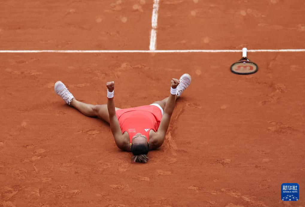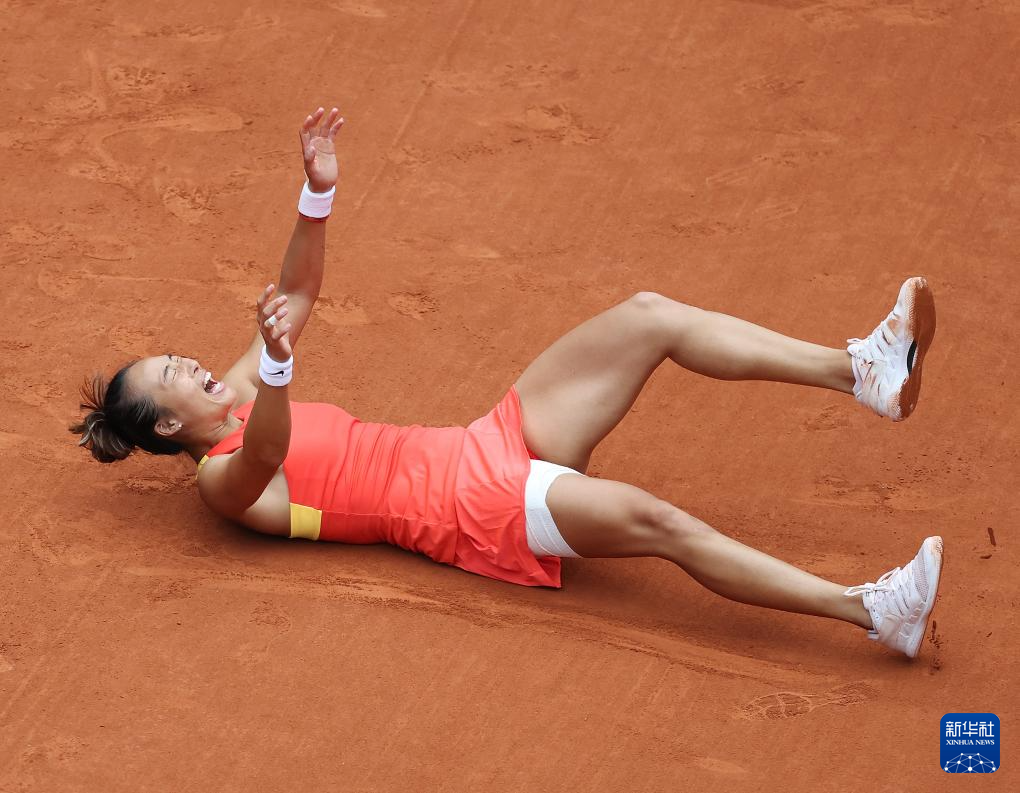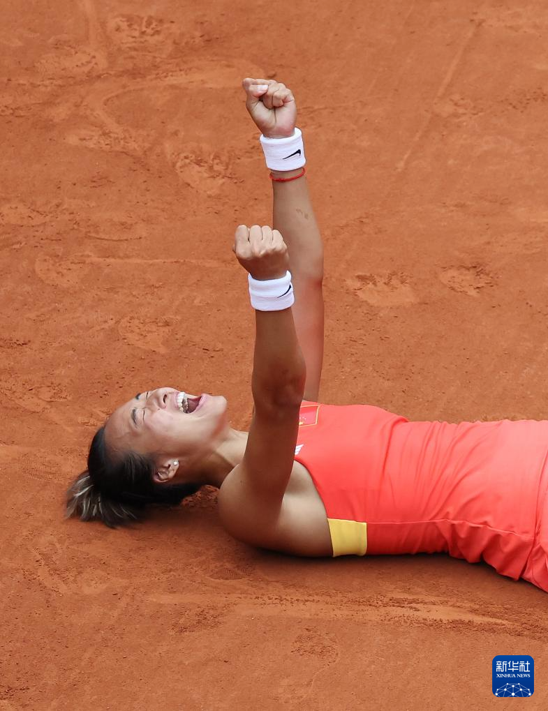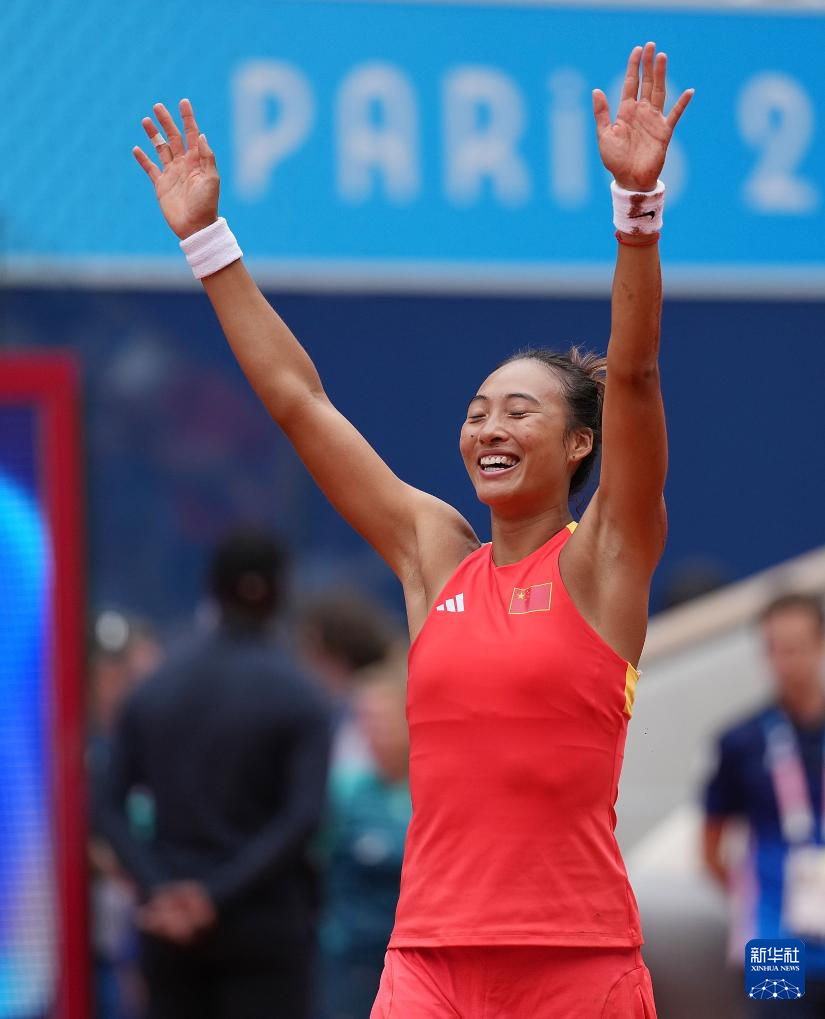 8月3日,郑钦文在比赛后庆祝夺冠。