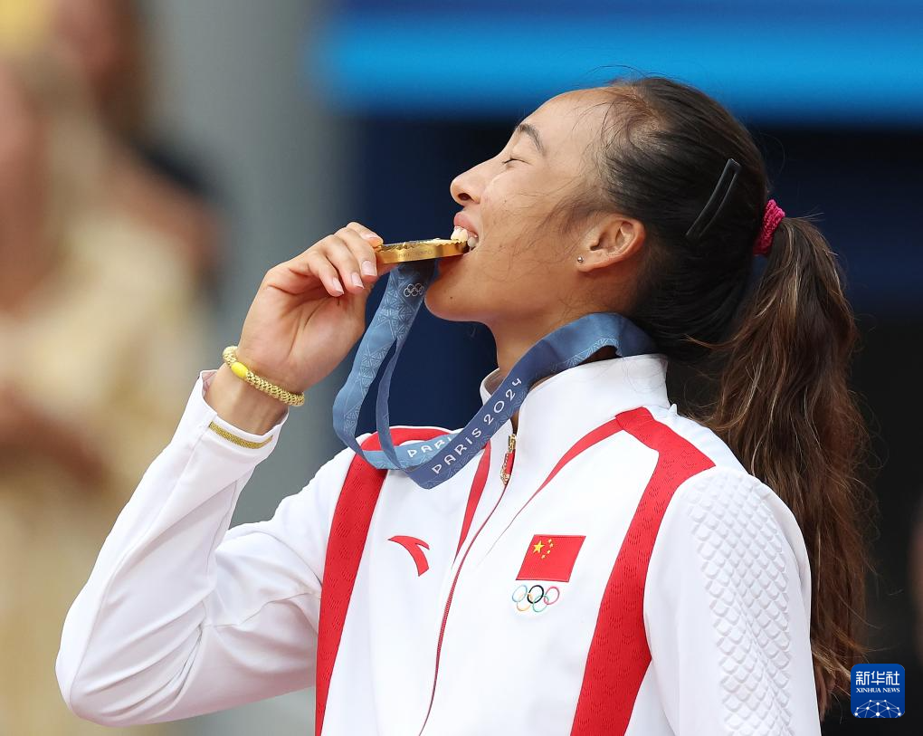 8月3日,郑钦文在颁奖仪式上亲吻金牌。