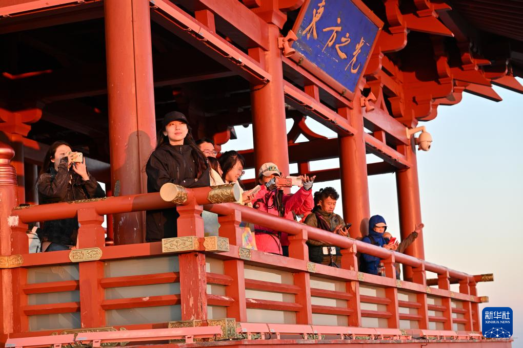 黑龙江省抚远市地处我国陆地最东端,有“华夏东极”之称。正值夏季旅游旺季,不少游客登上东极阁观赏日出。