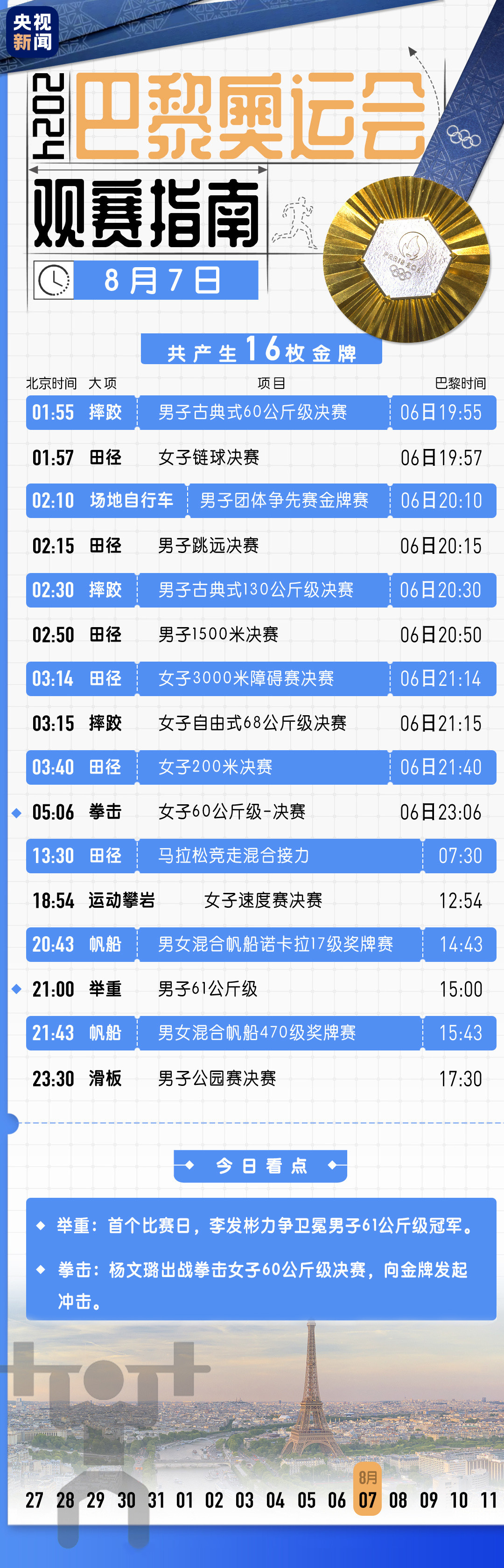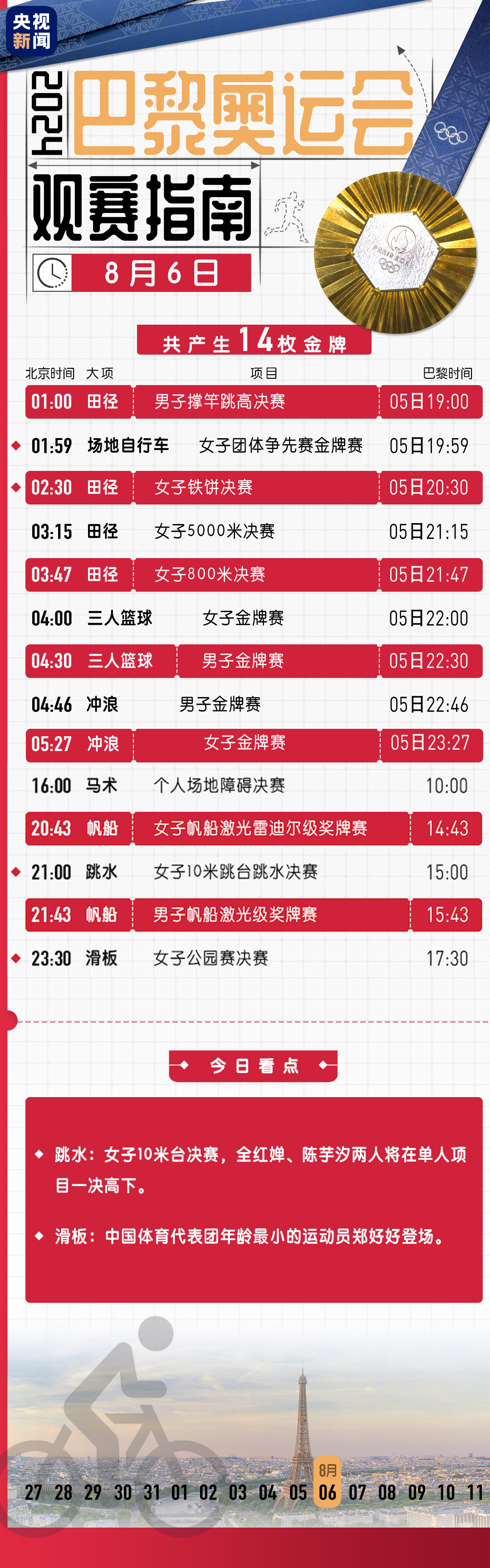 巴黎奥运会第十一个比赛日将产生15枚金牌。马术迎来收官之战,滑板、皮划艇静水比赛迎来巴黎奥运会首秀,中国体育代表团将向最高领奖台发起冲击。
