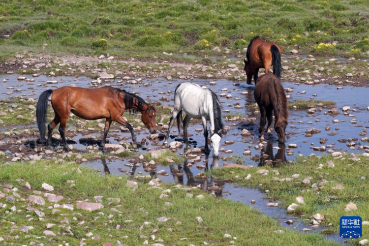 7月10日,马群在山丹马场草原上的溪流旁饮水。