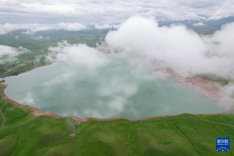 7月11日拍摄的云雾中的山丹马场鸾鸟湖(无人机照片)。