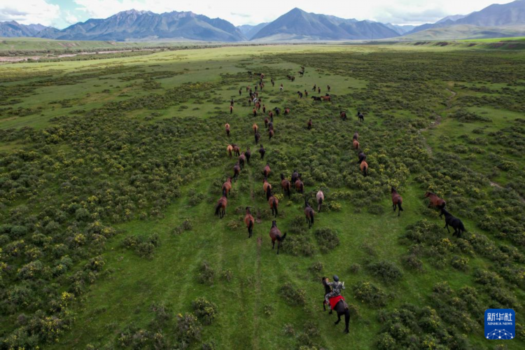 7月10日,山丹马场牧马人在草原上驱赶马群(无人机照片)。