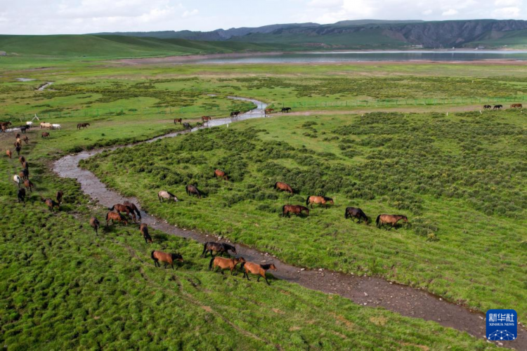 7月10日,马群在山丹马场草原上饮水觅食(无人机照片)。
