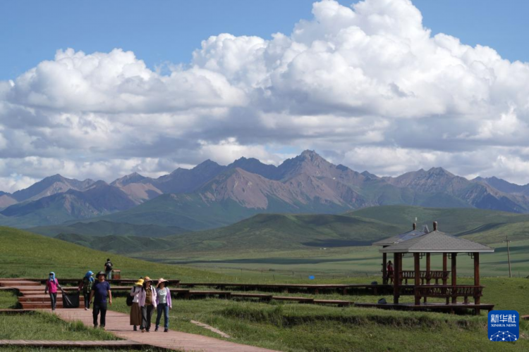 7月10日,游客在山丹马场鸾鸟湖畔游览赏景。
