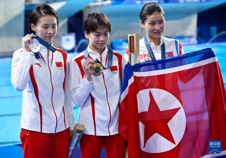8月6日,冠军中国选手全红婵(前中)、亚军中国选手陈芋汐(前左)、季军朝鲜选手金姬燕(前右)在颁奖仪式上。新华社记者 张玉薇 摄