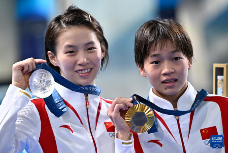 8月6日,全红婵(右)和陈芋汐展示奖牌。新华社记者 王鹏 摄