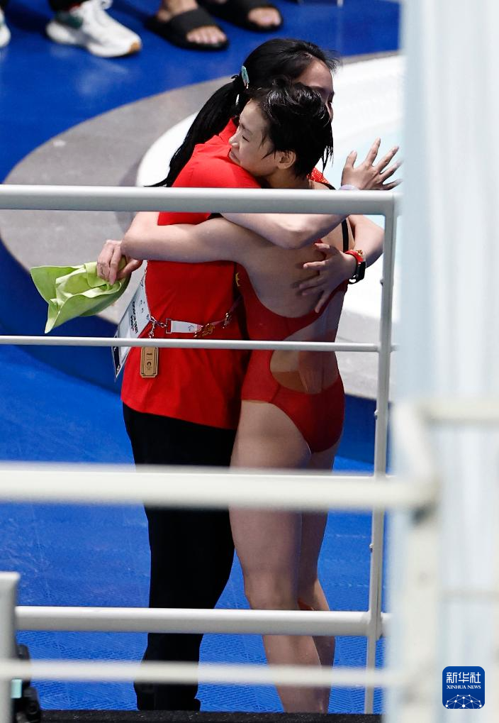 8月6日,中国选手全红婵(右)与教练陈若琳庆祝。新华社记者 张玉薇 摄