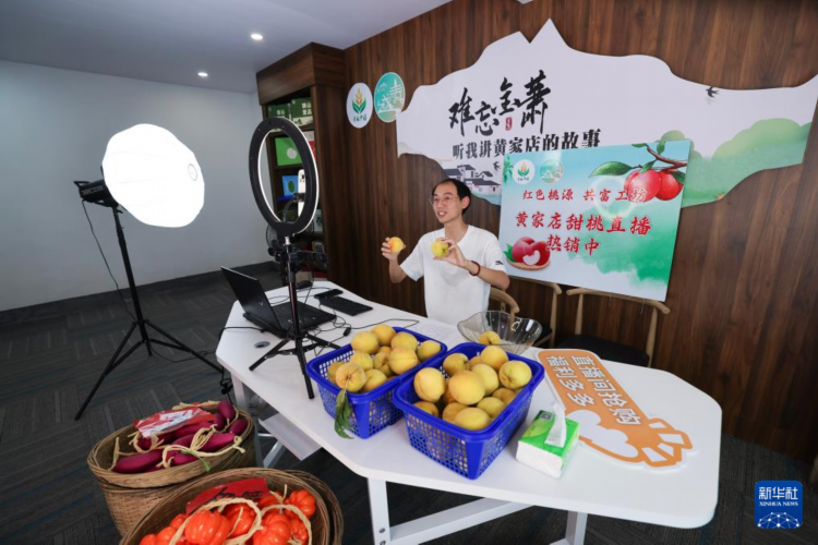 8月7日,在璜山镇黄家店村的共富直播站,黄家店村村干部在进行网上直播销售黄桃。这个直播站根据季节不同为村民直播销售高山蔬菜、水果、粉丝、香榧等各类特色农产品。