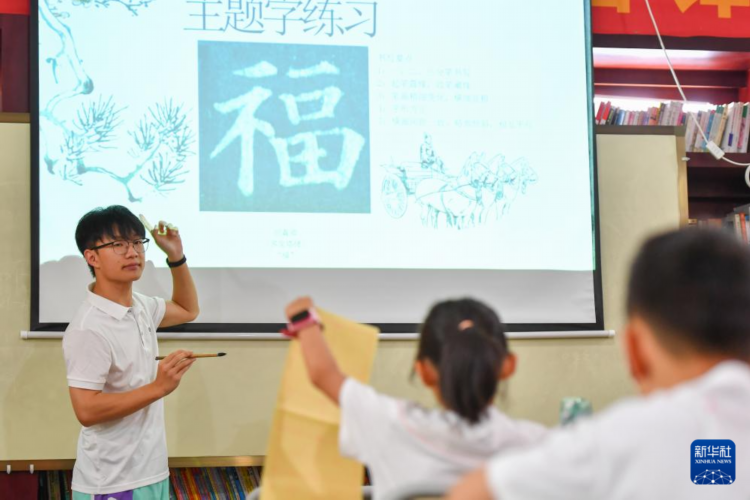 8月7日,在长沙市望城区月亮岛街道黄都港社区,志愿者在给小朋友上书法课。