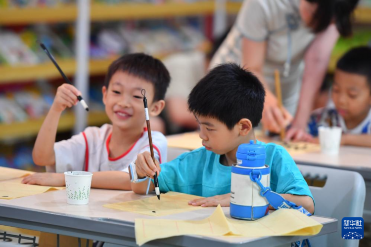 8月7日,在长沙市望城区月亮岛街道黄都港社区,小朋友在书法课上练习握笔。