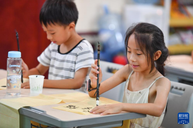 8月7日,在长沙市望城区月亮岛街道黄都港社区,小朋友在书法课上练习写字。