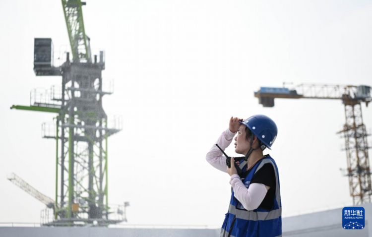 简李娟通过对讲机指挥协调塔吊作业(8月7日摄)。