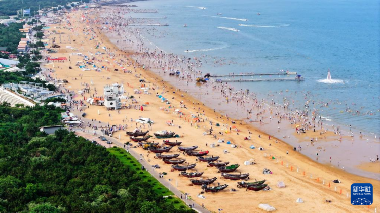 8月8日,在日照市万平口沙滩,游客在休闲消夏(无人机照片)。