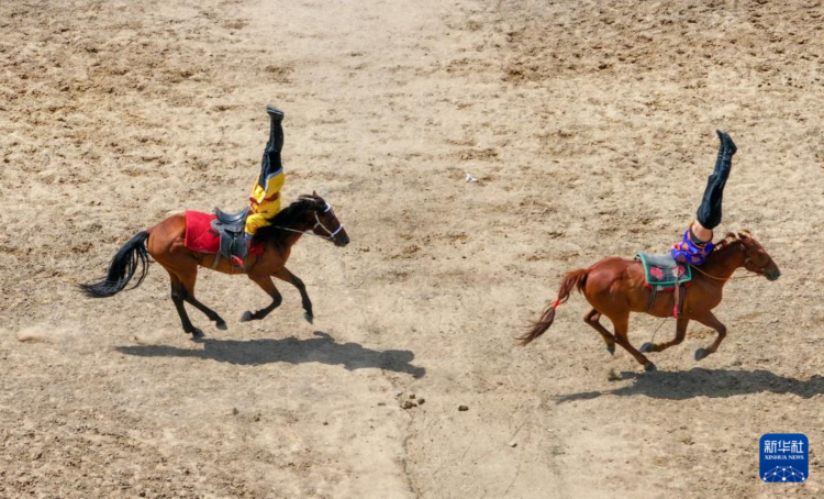 8月8日拍摄的2024兴安盟那达慕开幕式上的马术表演(无人机照片)。