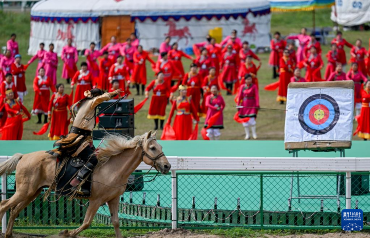 8月8日,骑射手在2024兴安盟那达慕开幕式现场表演。