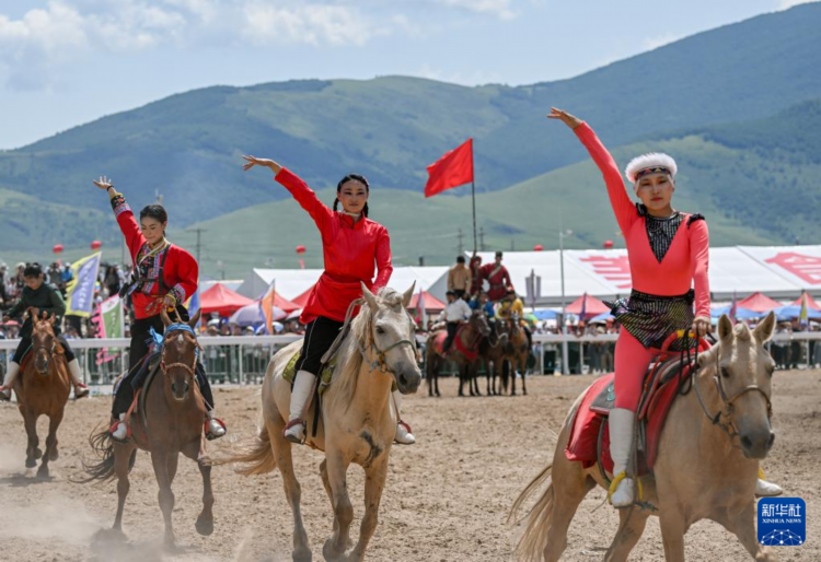 8月8日拍摄的2024兴安盟那达慕开幕式上的马术表演。