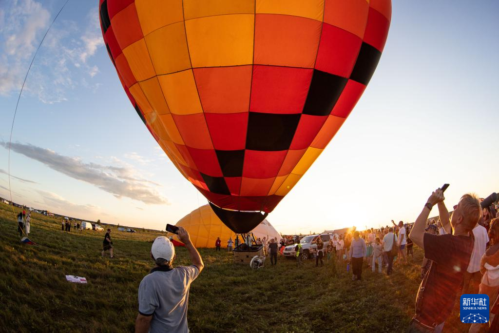 8月9日,在俄罗斯梁赞州,人们观看热气球充气。