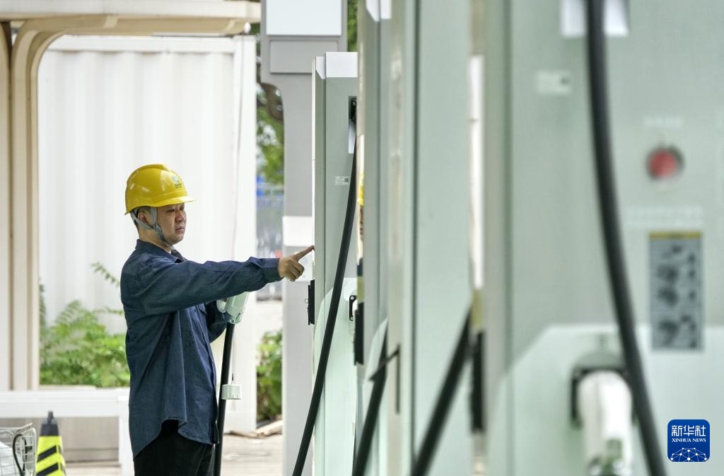 8月11日,在丰台丽泽商务区超级充电站,国网北京市电力公司技术人员在检测超级快充充电桩。