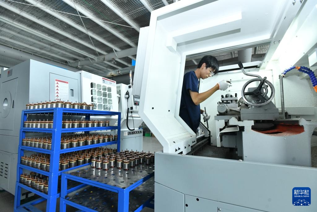 8月10日,在位于河间市的河北江轮机电有限公司,工人在汽车零部件生产线上工作。