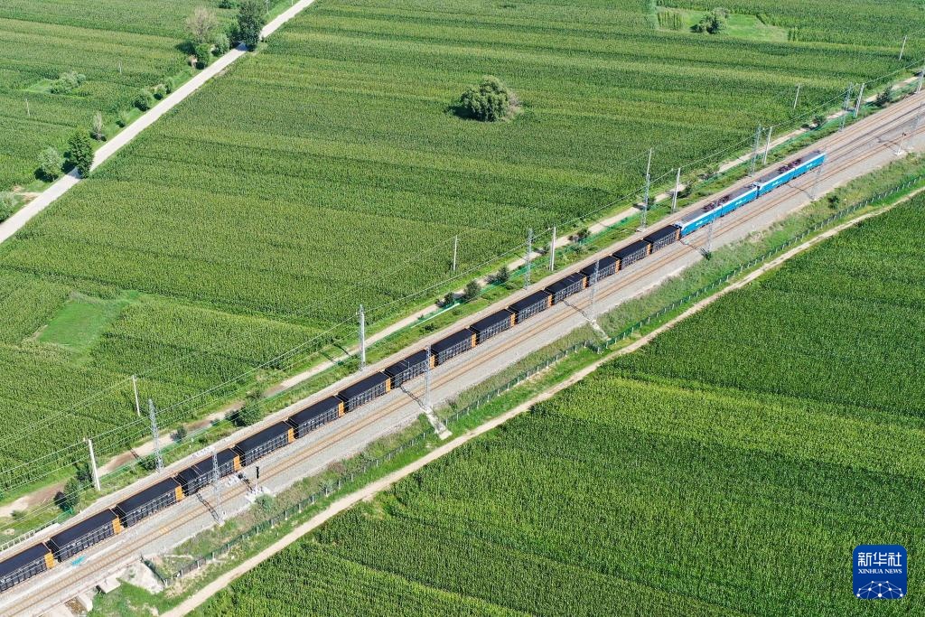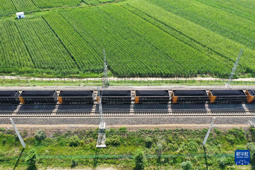 8月14日,一列运煤列车行驶在呼和浩特铁路物流中心王气营业室管辖的专用铁路上(无人机照片)。