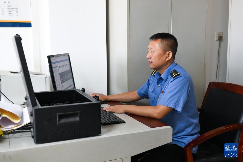 8月14日,呼和浩特铁路物流中心王气营业室工作人员通过“货车装载监控系统”检查运煤列车装载加固情况。