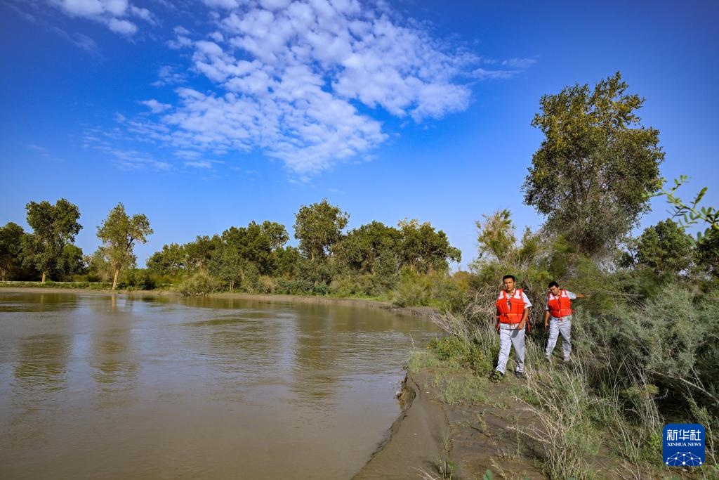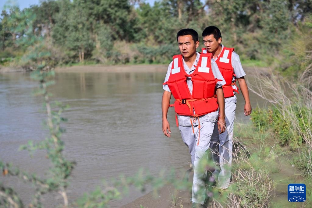 在新疆塔里木河尉犁段,才登巴(左)与同事王昕在干流河道巡查(8月13日摄)。