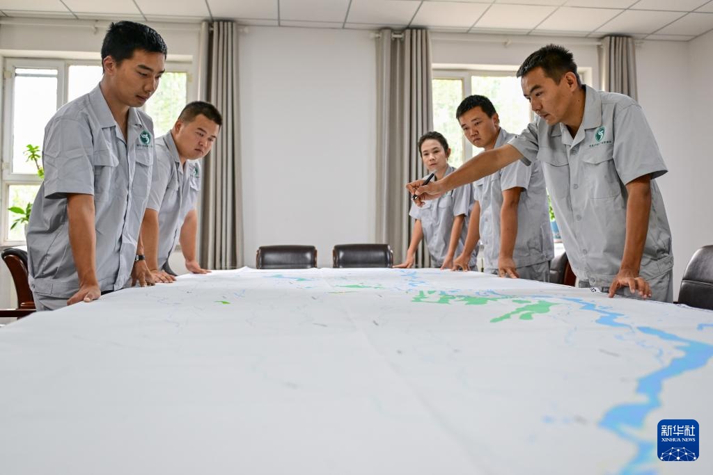 在新疆塔里木河流域干流管理局乌斯满管理站,才登巴(右一)和同事分析河道走势(8月13日摄)。