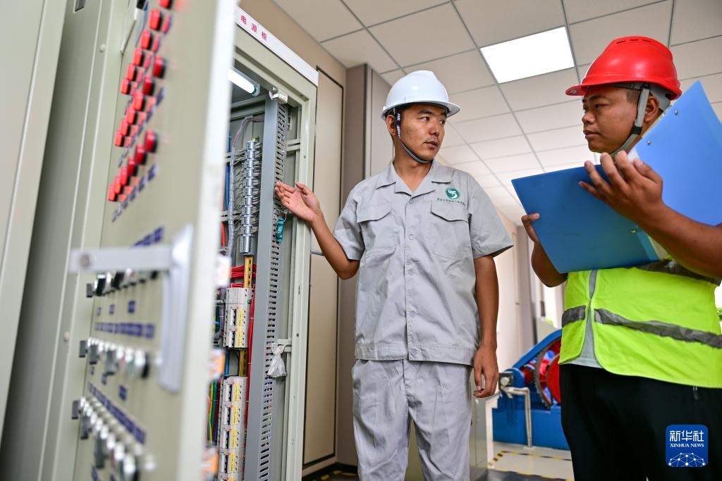 在新疆塔里木河流域干流乌斯满引水枢纽,才登巴(左)联合巡检单位开展电器设备检查(8月13日摄)。