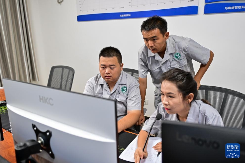 在新疆塔里木河流域干流管理局乌斯满管理站,才登巴(中)和同事在远程控制室查看水闸工程设备运行状况(8月13日摄)。