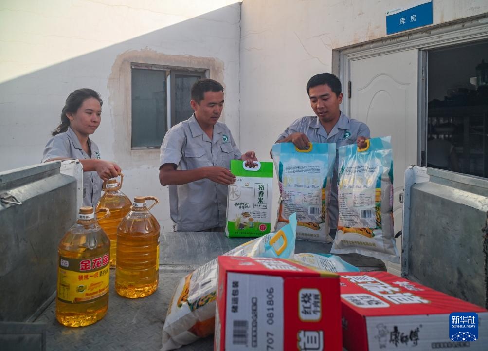 在新疆塔里木河干流乌斯满管理站,才登巴(中)和同事们搬运生活物资(8月13日摄)。管理站因距离周围乡镇较远,工作人员每10天左右集中采购一次生活物资。