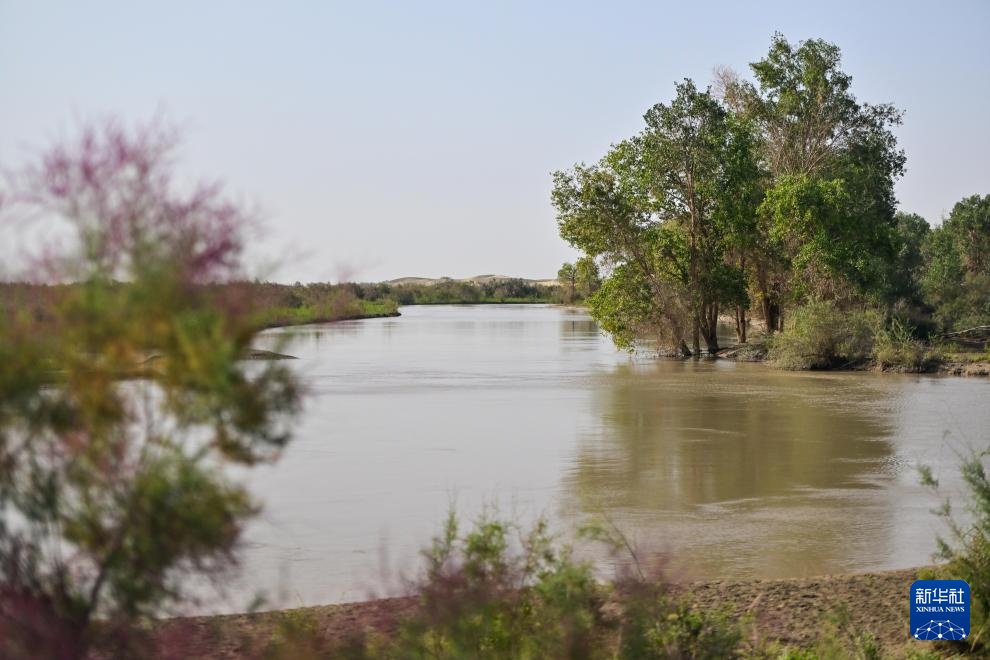 在新疆塔里木河尉犁段,塔里木河河水滋润两岸胡杨林(8月13日摄)。
